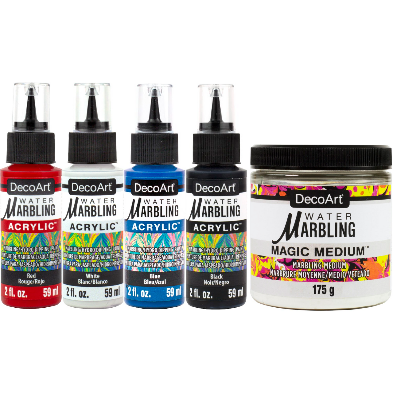 The 4th of July Water Marbling Set includes 4 stunning colors of premium water marbling paint in ready-to-use 2oz bottles with an easy drip tip. All of DecoArt's Water Marbling Acrylics are water-based. This set also includes an 8oz jar of Magic Medium.