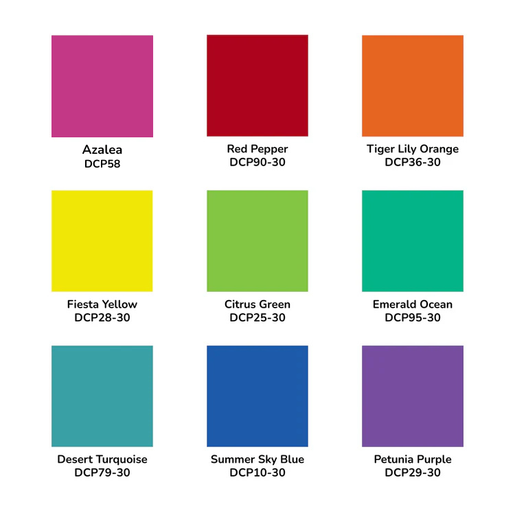 Color Palette: Azalea, Red Pepper, Tiger Lily Orange, Fiesta Yellow, Citrus Green, Emerald Ocean, Desert Turquoise, Summer Sky Blue, Petunia Purple